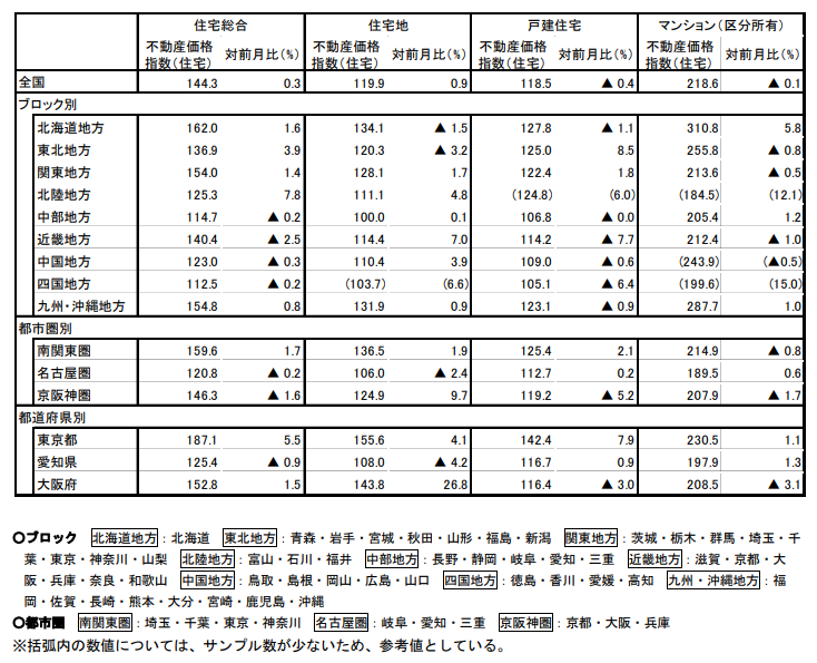 2025年8月の全国不動産価格指数は、住宅総合で144.3と前月比0.3%の小幅上昇となりました。