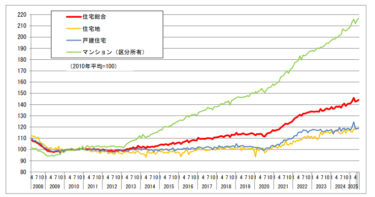 最新の不動産価格指数を見ると、マンションが過去最高水準を更新(2010年=100を基準に216.8)しており、依然として資産としての注目度が高いことが分かります。