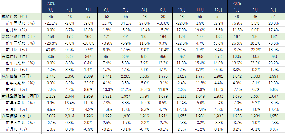中古戸建市場では、3月の成約件数は54件(前年比+20%)、成約価格も1,994万円(+12.3%)と好調に映ります。しかし在庫件数は993件と前年比23.2%増が3か月続いており、新規登録価格は前年比3.9%安、在庫価格も2.8%安と、出回る物件の価格は着実に低下しています。春需要による成約増の陰で、供給過多という構造問題は解消されていません。