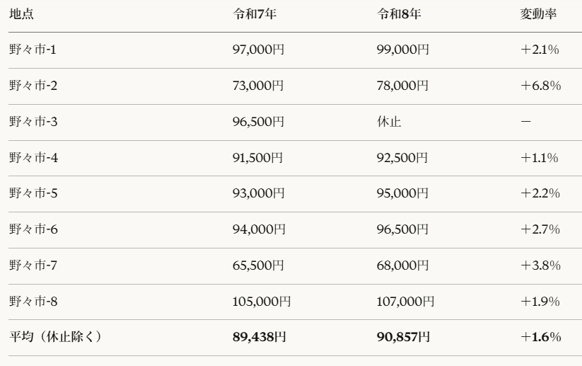 2026年(令和8年)の地価公示において、野々市市内の住宅地7地点(調査休止の1地点を除く)はすべて上昇しました。