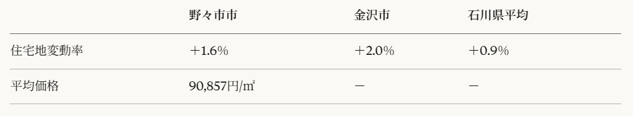 両市ともに石川県平均(+0.9%)を上回っており、金沢市・野々市市エリアは石川県内でも特に地価が安定して上昇しているエリアといえます。