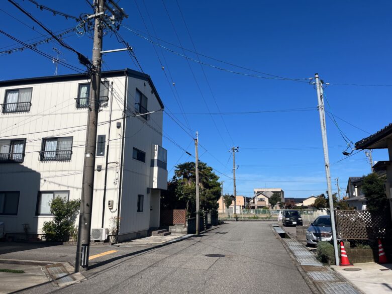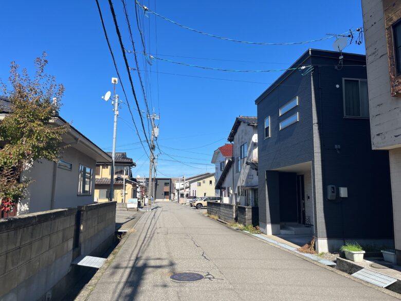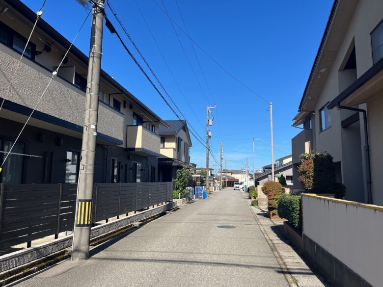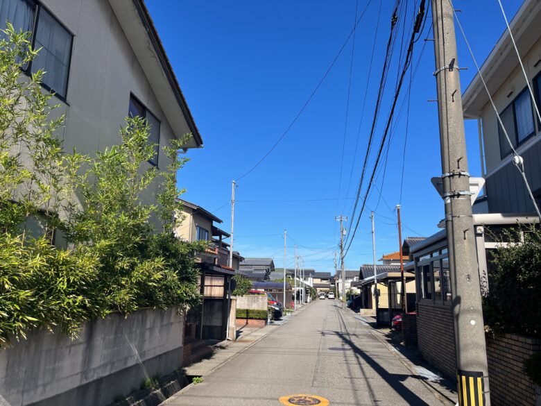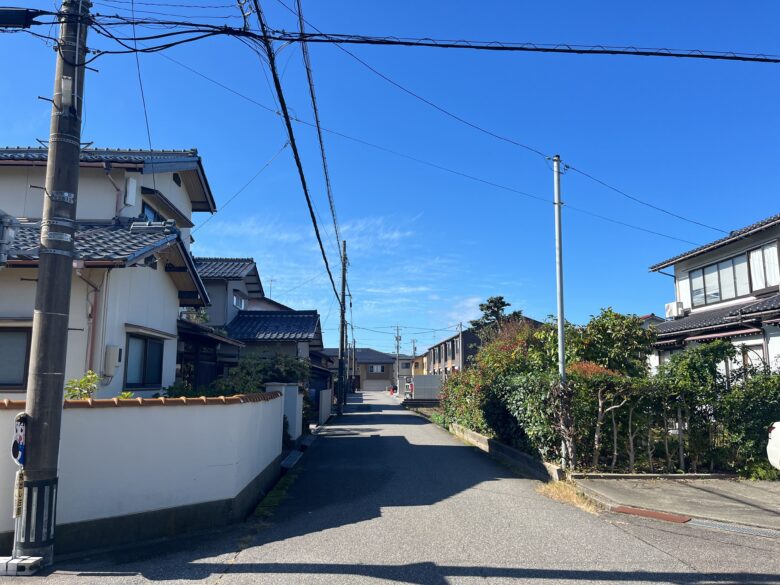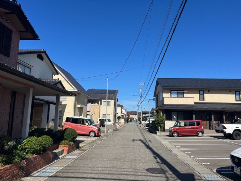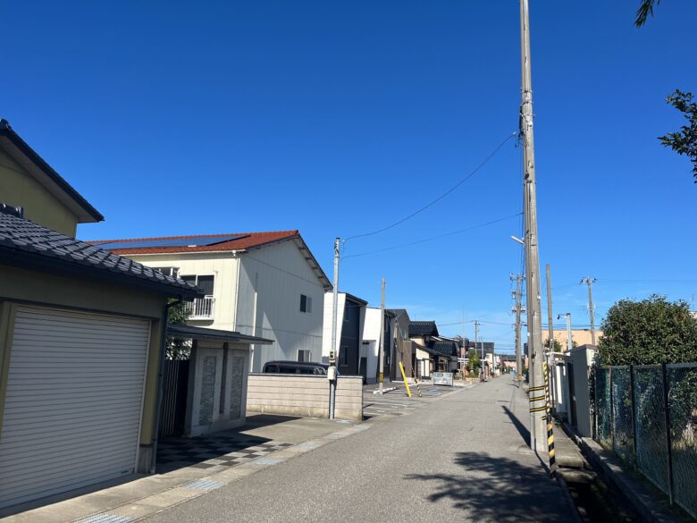 野々市市押越地域は、市の北部に位置し、穏やかな住宅地として成熟した街並みを形成しています。周辺には戸建住宅と共同住宅が広がり、国道8号線や157号線に出やすい立地にあるため、落ち着いた住環境を保ちながらも車での移動がしやすい点が特徴です。